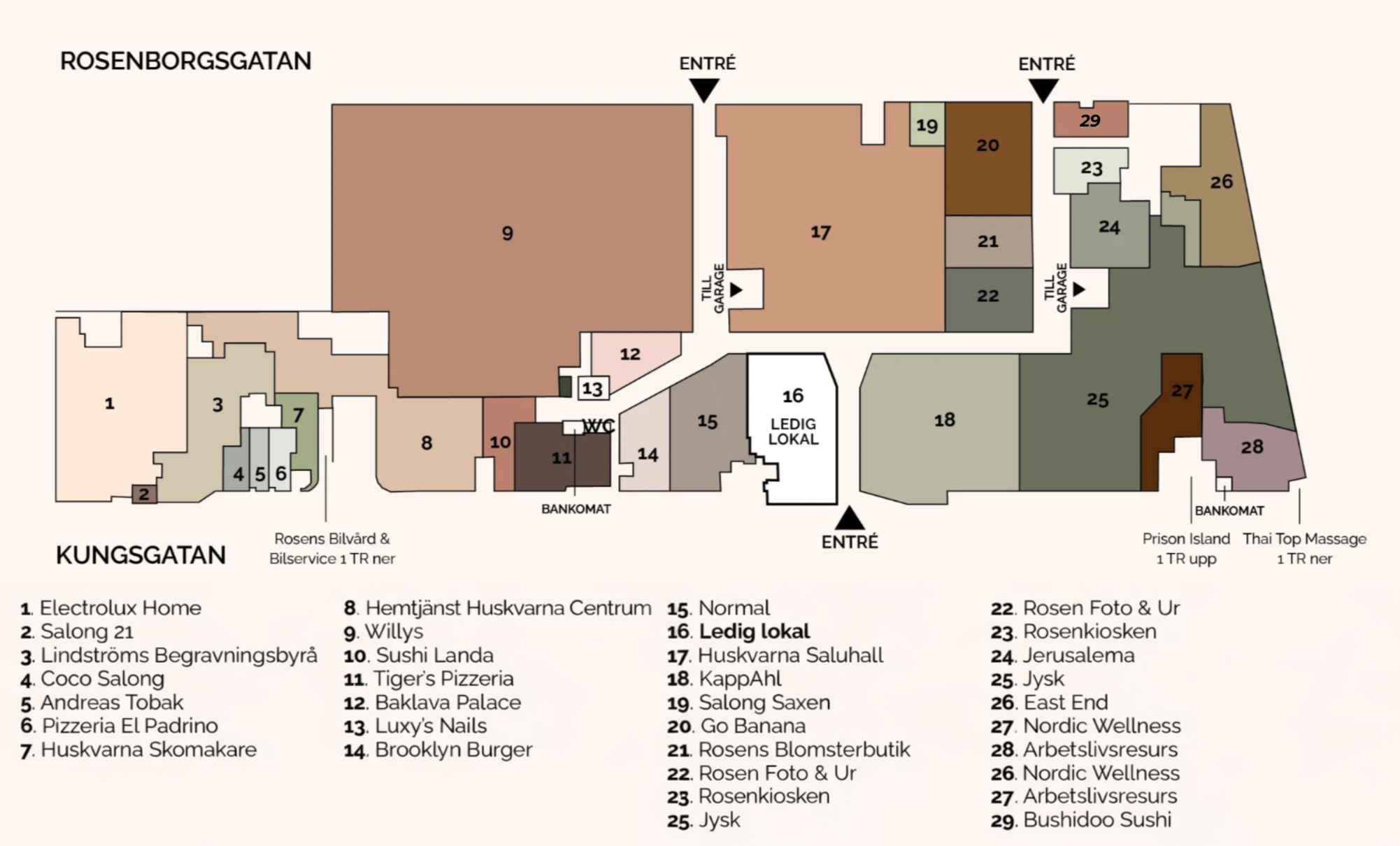 Butiker och verksamheter Butiker Electrolux HomeGo BananaHuskvarna SaluhallJerusalemaJyskKappahlNormalRosens BlomsterbutikRosen Foto & UrWillys Mat & Dryck Baklawa PalaceBrooklyn BurgerEast endEl Padrino PizzeriaSushi LandaTigers PizzeriaBushidoo Sushi Hälsa & Skönhet Coco SalongLuxy’s NailsNordic WellnessSalong 21Salong SaxenThai Top Massage Service Andreas TobakRosen BiltvättRosenkioskenRosens Klackbar Upplevelsecenter Prison Island
